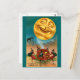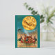 Ett lustigt vintage Halloween-kort med en grupp häxor som dansar runt en Jack O'Lantern under det ljusa leende måne.