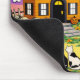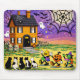 Lekfull Halloween-musselmatta med ett fantasifullt spökhus under fullmåne med spindelnät, fladdermöss, svävande spöken, svarta katter, leende pumpor och en liten häxa som korsar ett glödande höstfält. Ljus orange, lila och svarta toner ger denna läskigt söta design en rolig festlig look för säsongens skrivbordsdekoration.
