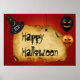 En Halloween-illustration med en gammal papper, häxhatt, en spindel och två jack-o-lanternballonger på röd bakgrund.