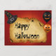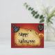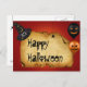 En Halloween-illustration med en gammal papper, häxhatt, en spindel och två jack-o-lanternballonger på röd bakgrund.