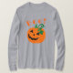 Trendiget och den sassliga orangen och grått Jack o lantern långärmad T-skjortan har ett lycklig-leende på ansikte och Boo! skriven ovan. Du kan ändra texten framtill och tillbaka till ett namn eller ett meddelande som du väljer. Det finns mycket mer stilar och färg hos barn och vuxarna.