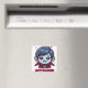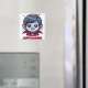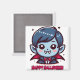 Ce design présente un charmant petit vampire aux traits stylisés et enfantins, parfait pour célébrer l’esprit d’Halloween. Le personnage arbore une peau bleutée avec des nuances subtiles et des joues rosées, évoquant une innocence juvénile. Ses yeux grands et expressifs sont accompagnés de petites étoiles scintillantes, ajoutant une touche magique à l’ensemble. La coiffure du vampire est d’un bleu profond avec des reflets plus clairs, ce qui crée un contraste agréable avec le teint de sa peau. Il porte un costume classique de vampire composé d’une cape rouge vif doublée de noir et d’un nœud papillon rouge à pois blancs, ce qui lui donne un air à la fois élégant et festif. Les canines proéminentes du sourire espiègle rappellent son identité vampirique tout en conservant une allure adorable et accessible. Le texte “Happy Halloween” en lettres arrondies et amicales surplombe le personnage, renforçant le thème festif avec une typographie qui évoque la convivialité et la joie des célébrations d’Halloween.