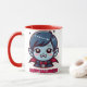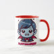 Ce design présente un charmant petit vampire aux traits stylisés et enfantins, parfait pour célébrer l’esprit d’Halloween. Le personnage arbore une peau bleutée avec des nuances subtiles et des joues rosées, évoquant une innocence juvénile. Ses yeux grands et expressifs sont accompagnés de petites étoiles scintillantes, ajoutant une touche magique à l’ensemble. La coiffure du vampire est d’un bleu profond avec des reflets plus clairs, ce qui crée un contraste agréable avec le teint de sa peau. Il porte un costume classique de vampire composé d’une cape rouge vif doublée de noir et d’un nœud papillon rouge à pois blancs, ce qui lui donne un air à la fois élégant et festif. Les canines proéminentes du sourire espiègle rappellent son identité vampirique tout en conservant une allure adorable et accessible. Le texte “Happy Halloween” en lettres arrondies et amicales surplombe le personnage, renforçant le thème festif avec une typographie qui évoque la convivialité et la joie des célébrations d’Halloween.