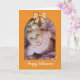 En glad Halloween-fotokortsdesign med ett bågfoto ram trimmade med en orange och vit gingham-båge överst och en mindre matchande båge i hörnet. Polka-punktens bakgrund ger en lekfull charm och skapar den perfekt för att skicka en söt Halloween hälsning till nära och kära. Idealisk för att ett festligt fallfoto med morföräldrar, släktingar eller vänner - innan den stora natten kommer!