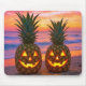 Two carved pineapples glow like jack-o'-lanterns on a sandy beach as ocean waves lap gently at the shore under a vibrant sunset sky