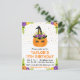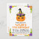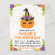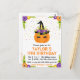 Bedårande orange pumpa med ett gyllene enhörningshorn, enhörningsöron och en svart häxhatt. Den vita bakgrunden har orange, gul, grön och lila Halloween-konfetti och blomstermotiv i hörnen.
