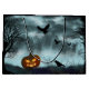 Vibrant Halloween-design med en glödande pumpning med starkt ögon och tänder i ett mörk landskap med träd och ravens.