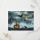 Vibrant Halloween-design med en glödande pumpning med starkt ögon och tänder i ett mörk landskap med träd och ravens.
