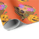 Roligt färgrik Halloween gåvasjal. Gulligt slående in papper för halloween fest, dörr värderar hög, eller happy halloweenfödelsedagen behandla som ett barn.