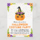 Orange pumpar med en enmajshorn i guld, öron och en svart häxhatt. Den vita bakgrunden har orange, gult, grönt och lila Halloween konetti och blommigt blommor och löv i hörnen. Grafik efter rätt Grafik