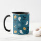 Cute kaffe mugg med vismisk Halloween spöken, pumpor, spindelnät och fladdermus mot en mörk blått bakgrund.