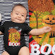 Lätt till-shirt Halloween eller Harvest Party Costume för baby. Underbar för er kyrka Party! Cute Pumpkin-familjen står vid Träd med Orange Höst löv på en t-shirt. Vita måne och moln med en vän som leende Halloween-Pumpkin Head-familj med en vän BOO! Med fjol Öga ovanpå varje stort Brev! Lägger till Rand-bakgrund för Red and Gult Graphic. liknar en japansk Flagga-design för Sol