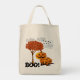 Halloween Bus eller godis Bags. Cute Pumpkin-familjen står vid Träd med Orange Höst löv på en Sturdy Tote Bag. Vita måne och moln med en vän som leker Halloween-Pumpkin Head-familj med en BIG Friendly Boo!