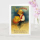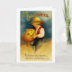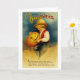 Vintage Halloween-hälsningskort som visar ett viktoriskt barn som bär en jack eller ett lyktglas med texten "Det är Halloween när små pojkar skräms av det minsta ljudet, och små flickor springa går till sängs och klättrar snabbt och gömmer huvudet."