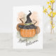 Firar Halloween med en liten bit stollig! Det här festkortet har en munklig pumpad sport, en häxhatt, perfekt för att skicka pooky önskemål och Halloween cheer, och handskriven "Happy halloween".