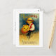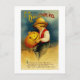 Vintage Halloween-hälsningskort som visar ett viktoriskt barn som bär en jack eller ett lyktglas med texten "Det är Halloween när små pojkar skräms av det minsta ljudet, och små flickor springa går till sängs och klättrar snabbt och gömmer huvudet."