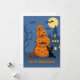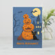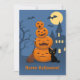 Cute black cat and a witch broom near a stack of laughing pumpkins that are falling over. A dead tree, a creepy mansion, some bats, and the moon are seen on the background. Customizable text.