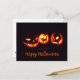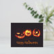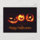 Ett vykort med 3 karterade Halloween-dockor. En med en skrämmande ansikte med vassa tänder, en böjd läskig katt och en slipande skalle på mörkens bakgrund.