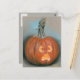 I detta Halloween-vykort finns grafik i mjuka pastellskuggor som skildrar en skuren pumpa med en söt, men ändå söt, kor-ögd Jack o’ lantern ansikte.