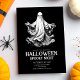 Skådekort för en Halloween fest med ett svartvitt spöke. Kontrollera matchningssamlingen för SAMORDNINGSOBJEKT. Originalteckningar efter PUPSIKU STUDIO. 100 % unika produkter.