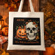 Add eerie charm to your Halloween tote bag this haunting Halloween bag featuring the phrase “Where Skulls Grin and Pumpkins Glow.”