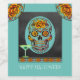 Halloween fest vin flaska, med en sockerskalle och dekorativ blomma inslag i gult, turkos och orange med dekorativ typ.