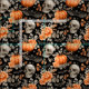 En charmig, handmålad vattenfärg Halloween mönster med pumpor, döskallar, fladdermus och höstblommor i svart bakgrund. Den djärva orangen och svarta tonen ge är en vintage, en mysigt känsla - perfekt för väv från säsong, avsmällning och festlig décor.
