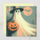 Fira magin med den kusliga årstiden med detta fyrkantiga vykort som har en gammal Halloween-illustration som fångar all charm och nyckfullhet från gamla oktobernätter. I mitten av denna nostalgiska design finns en söt spöke iklädd en klassisk spetsig häxa hatt, vars breda kant kastar en lekfull skugga över spökets glada ansikte. I spökets händer vilar en grinande jack-o'-lantern, vars snittyta lyser med Halloween-traditionens värme. Bakom dem stiger månen stor och ljus, kastar ett eteriskt sken över hela scenen. Fladdermöss fladdrar över månens ansikte och lägger till en touch av gotisk flärd till den mjuka, förtrollade atmosfären. Färgerna är perfekt retro - rika orangea, varma gula,