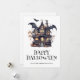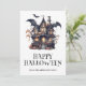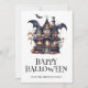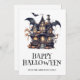 Vackert Halloween-kort med ett sött hemsökt hus, pumpor och fladdermus. Anpassa enkelt det här vattenfärgen Halloween-kortet med din familj namn och text.