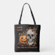 Add eerie charm to your Halloween tote bag this haunting Halloween bag featuring the phrase “Where Skulls Grin and Pumpkins Glow.”