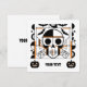 En djärv och modern Halloween-design med en geometrisk Bauhaus-stil-skalle, fladdermus, spindelnät och pumpor i klassisk svart, vit och orange. Perfekt för skämtsäsongen älskare som vill ha en snyggt vrid på den traditionella halloweenkonsten.
