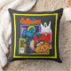 Den här klippbilden har Halloween-varelser. Ett fullt, ett spöke, en pumpa, en häxa och en gravsten finns i ett block skrämmande färg. En banderoll med Halloween och fladdermus visas överst. En gult gräns lades också till på framsidan och baksidan för att få en mer Halloween- effekt. Allt detta visas på en svart bakgrund. Dessa kuddar finns i olika stilar och storlekar.