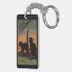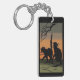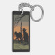 Bilden visar 2 svarta katter med ett glansigt ögon på ett gräsmatch under gren i ett dött träd. Himlar längst bak är en orange och ljussvart färg. Ett svart gräns lades till. Dessa nyckelringar finns i olika stilar och storlekar.