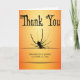 Halloween Tacksamhetskort med stor skrämmande svart spindel och anpassningsbar svart text där du kan lägga till Brud och Brudgums namn, Bröllopsdatum och meddelande, tryckt på orange bakgrund. Det kan användas som ett bröllop Tacksamhetskort eller efterfest Tacksamhetskort.