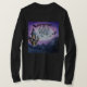 Halloween Tee visade svart med longtärmade och häxor ord på lila och blå bakgrund med fladdermöss och ett gammalt vevyhus. Tack vare Kreativet Fabrica för en del av inslag i designen.