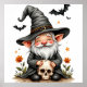 Söt Halloween-gnom-sticker, mugg, kudde, affisch och t-shirt med en vänlig häxgnom som håller en dödskalle. Perfekt för att lägga till en spöklik touch i ditt hem eller garderob.