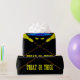 Teckning i en blå guds hatt, dekorerad med gultens stjärnor och två korsade häxaromer under hatten. Demonistisk gult öga mellan hatten och bommen och ett textfördrag eller trick. Lustigt Halloween-tema. Ät, drick och läsk. Vågrät- eller landskapsinriktade produkter och souvenirer.