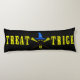 Teckning i en blå guds hatt, dekorerad med gultens stjärnor och två korsade häxaromer under hatten. Demonistisk gult öga mellan hatten och bommen och ett textfördrag eller trick. Lustigt Halloween-tema. Ät, drick och läsk. Panoramiska produkter och souvenirer.
