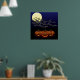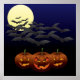 Tre Halloween-lyktor med flygande fladdermus på en mononlyst mörk bakgrund.