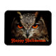 Ett vackert foto av ett uggla med "Happy halloween"-meddelande gör den här magneten till en underbar dekoration för Halloween!
