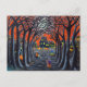 Halloween-vykort med en scen av en häxa som återvänder hem efter en lång dag av skrämmande dödliga. Hennes systerhäxor kan inte vänta på hennes äventyr... de har har en lugnande bruna som går i väntan på några vilder. Art med titeln "Hemma till Broomtree" av Christine Altmann