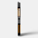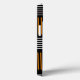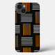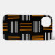 Telefonväskan har en modern design i mitten av århundradet som ser ut som en väv med orange och vitt linjer på en fält av svart.