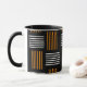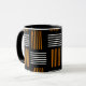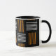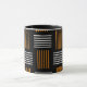 Mugg har en modern utformning i mitten av århundradet som ser ut som en väv med orange och vitt linjer på en svart fält.