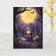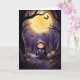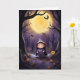 Den här bilden visar en viskartad, Halloween-temerad scen med en ung flicka utklädd till en häxa. Flickan bär en lila klänning, en häxhatt och en kloak och håller ett litet trollspö. Hon står i en mörk, en eerie-skog med vridet, blöjfritt träd under ett stort, ljust fullt. Fladdermus flyger runt och det finns karvade jack-o-lyktor som är spridda på marken och som tillför halloween-atmosfären. Stil är illustrativt och tecknad, ge är det en magisk och spännande känsla.