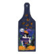 En häxa som är klädd i lila och orangar med sockerskalle day of the dead. Svart katt, kauldronpumpor och en fullt måne bakom dem.