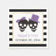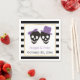 Pappersservett med halloweenbröllop med skelettpar och randigt lila tema. Ett roligt skelettpar och en randig kant gjord av svarta och vita ränder är huvudelementen i denna halloweenbröllopsdesign tillsammans med din text i vit ram. Brudgummen har en lila hatt medan bruden bär en lila rosett.