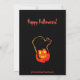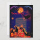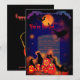 Inbjudan till Halloweenfest visar gravsten på kyrkogård med orange gul fullmåne på mörkblå natthimmel. Svarta fåglar och korpar, lysande orange pumpor och svart katt i förgrunden omslutna av orange dimma. Texten längst fram Du är inbjuden i orange spöklik text. Text på gravstenen med din festinformation. Överst finns en utsmyckning i gotisk stil. Baksidan av inbjudan visar en svart katt på en lysande halloweenpumpa med texten i orange Glad Halloween. Bakgrund mörkblå.