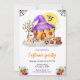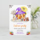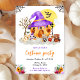 Den här söta och roliga vattenfärgade Halloween-inbjudan har ett pumpahus och söta djur i fin klänning. Texten kombinerar handskriven skrift och sans serif-teckensnitt för en stilren och modern look. Blomsterarrangemang och spindelnät ger en rustik och kuslig touch. Detta är perfekt för en kostymfest eller trick-or-treat.
