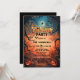 Skrämmande Halloween-inbjudan med pumpor, nattlig skogsscen, fladdermöss, måne....i orange, svarta och blå färger. Perfekt för kostymfest för barn eller vuxna inbjudan