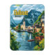 En bild och nostalgisk bild av Hallstatt, Österrike, som är känd för sin fantastiska alpina miljö, historiska charm och pituresque vid havsviken. Utformningen fångar byns ikoniska pastel-färgad som reflekteras i det tysta vatten på Hallstätter See (Sjö Hallstatt), omgiven av bergsberg. I en vintage stil ger konstverket upphov till Hallstatts friska skönhet och tidlösa allure och uppmanar tittarna att uppleva sina idylliska landskap och rikens kulturarv.
